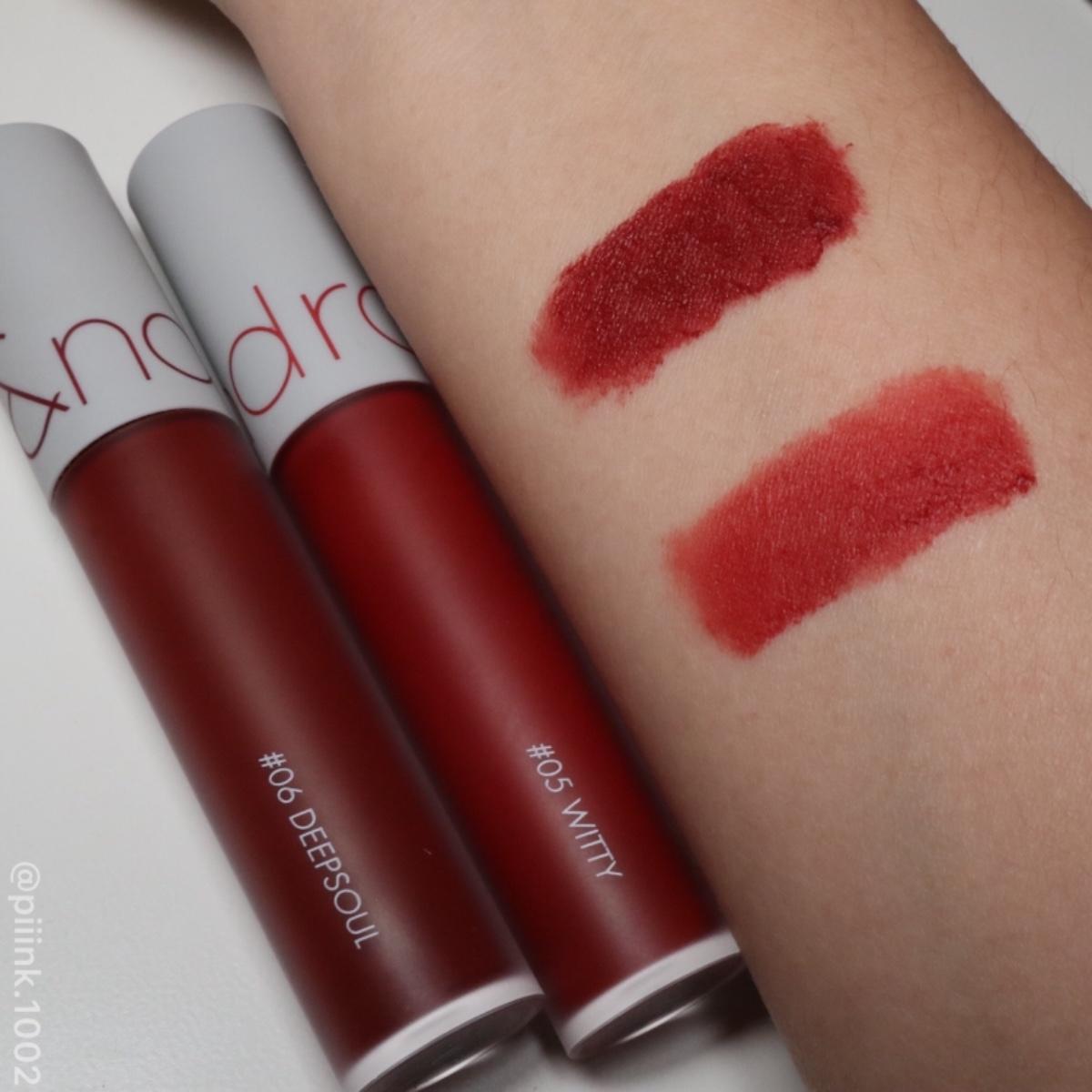 DEEPSOUL就是超顯白紅棕色,WITTY則是活潑的橘棕色。一樣是我最愛的絲絨質地,上唇是霧面但不會乾,不要碰到油持久度都很好。上次擦它吃便當為了實測,吃完之後是嘴巴內側掉光😂