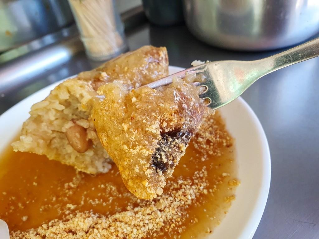 撒上滿滿的花生粉,裡面有包香菇、三層肉、花生、蛋黃,再來碗豬血湯最對味🉐
