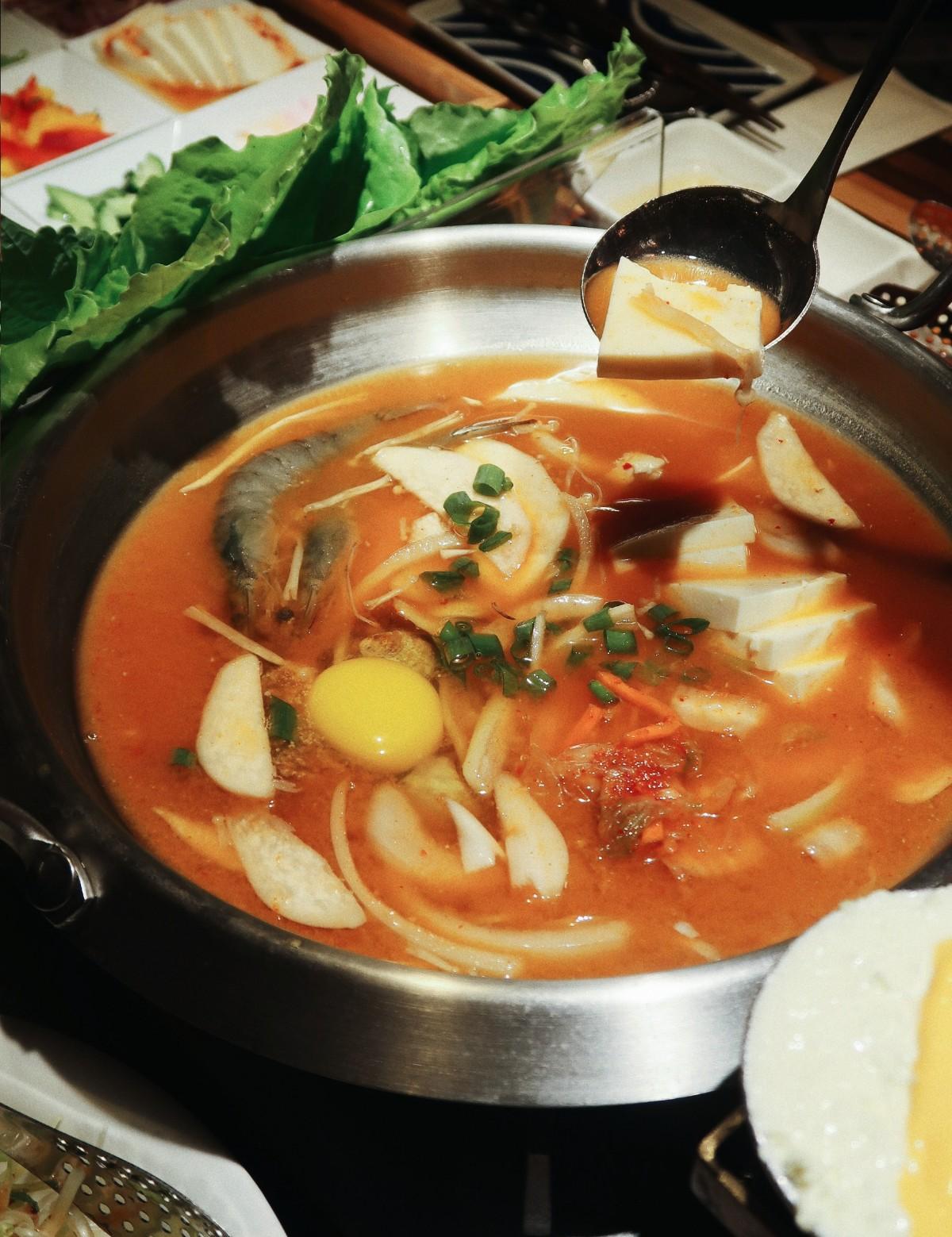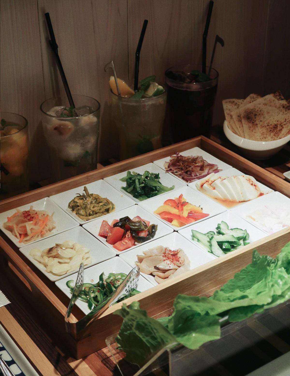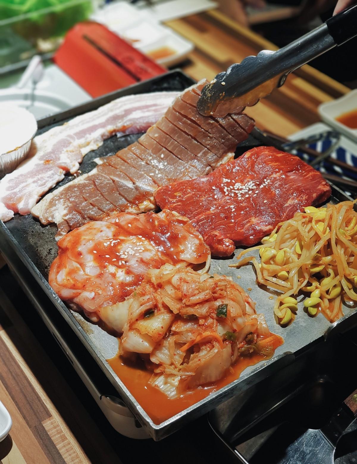第一次來的客人店家都會推薦套餐,當天點了入門套餐。肉的部份有上等三層肉(三層肉口味有很多種可以選),辣醬雞腿肉超級嫩很好吃,跟蜜汁豬排(使用鳳梨下去醃漬,甜甜的有口感)。生菜都是無限吃到飽所以喜歡生菜包肉的人不用擔心生菜吃完!配料有12種搭配吃法多達30種自由搭配,我覺得最好吃的是墨西哥餅皮的搭配🤤套餐內就有含海鮮豆腐湯鍋跟韓式炒拌飯哦!