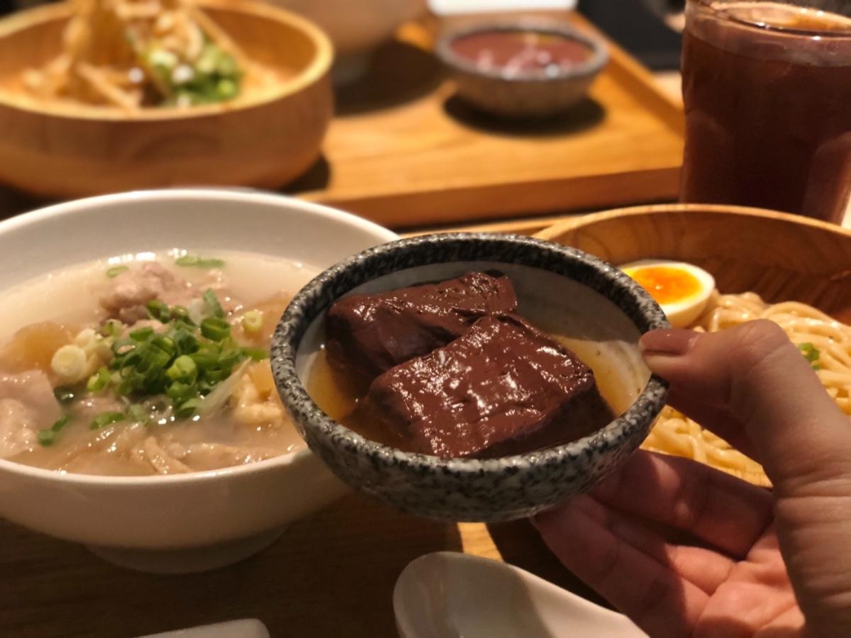 首先,有一客滷鴨血,很入味。牛筋很軟、牛肉片很爽口,牛肉片是要沾醬吃的,只有一點點辣而已。至於銷魂麵,它是拌麵來的,上面撒上蔥花再附上一顆糖心蛋,很好吃👍🏼