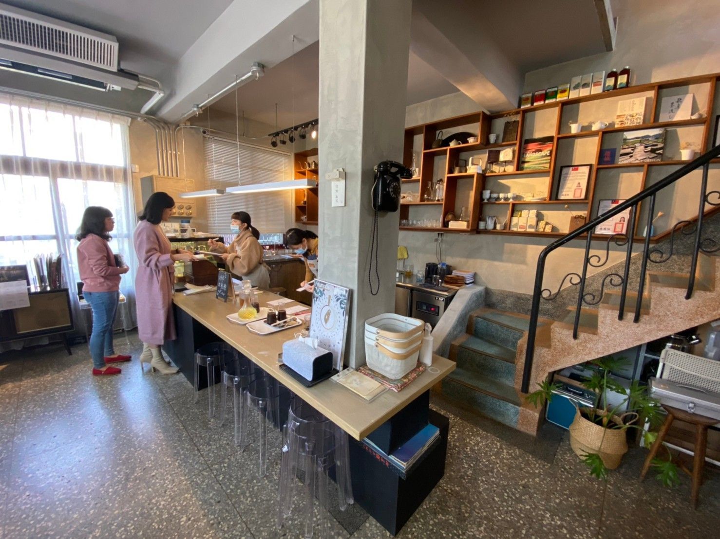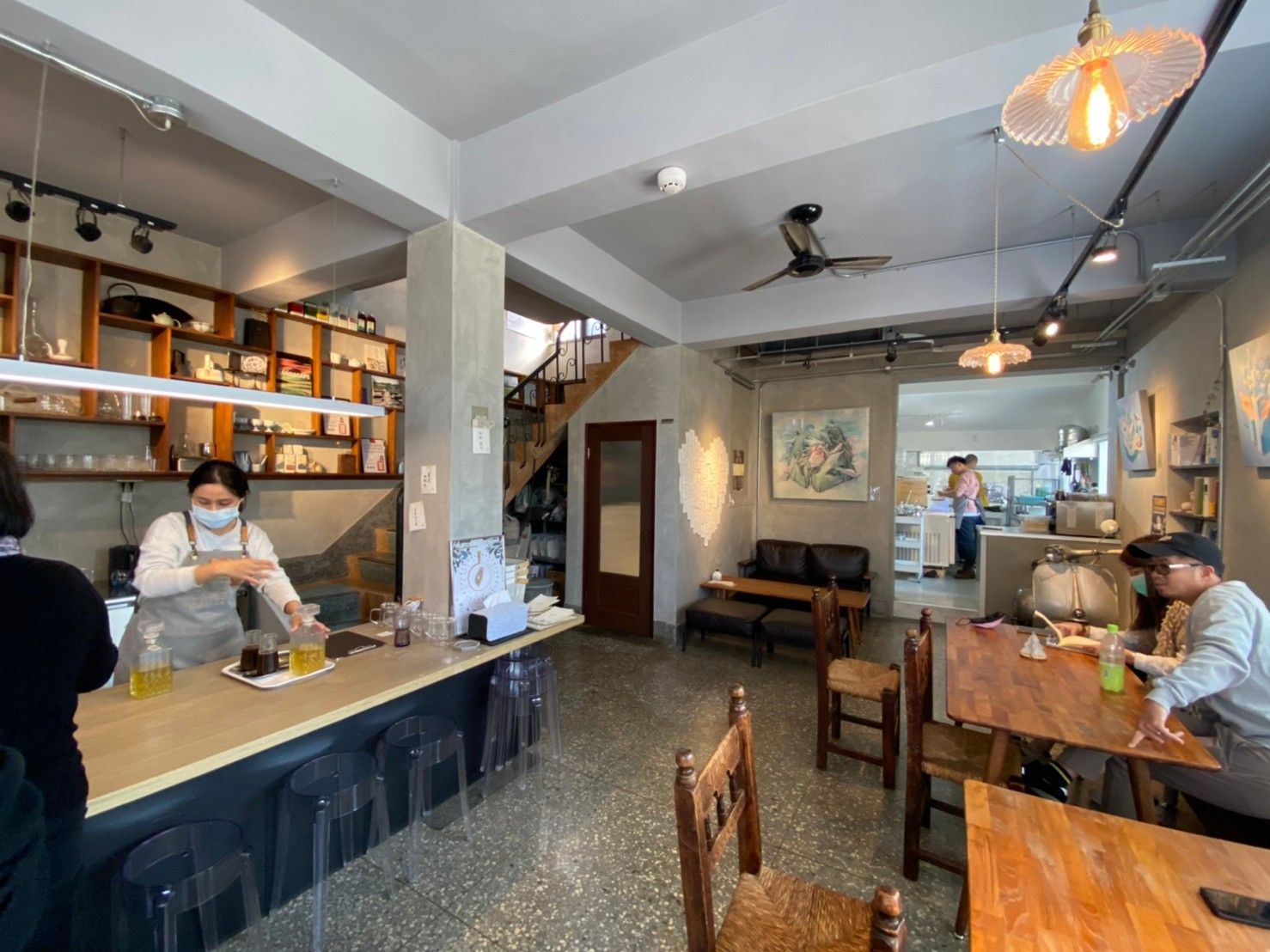 從門口看進去的一樓。後面是廚房,一樓有三張四人桌,樓梯下方的長方形門就是廁所,二樓也有一間。
