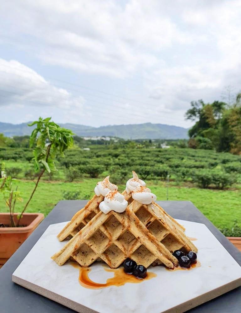 吃飽閒閒就來閒閒呷甜甜工作室🍰☕在白色貨櫃屋裡吃小山鬆餅喝紅烏龍,再來一塊芋頭千層蛋糕,咬得到新鮮芋頭顆粒🎏充滿蛋香的Q嫩麵皮+低糖鮮奶油,療癒的幸福下午茶,CP值很高的景觀餐廳喔💕