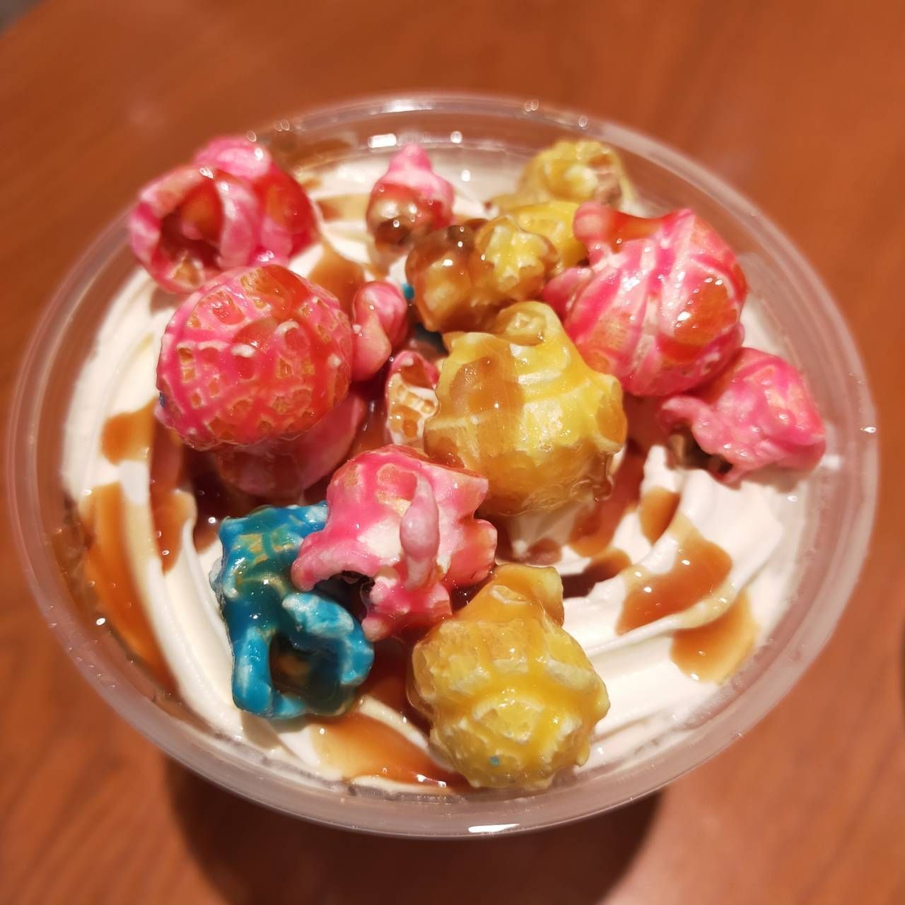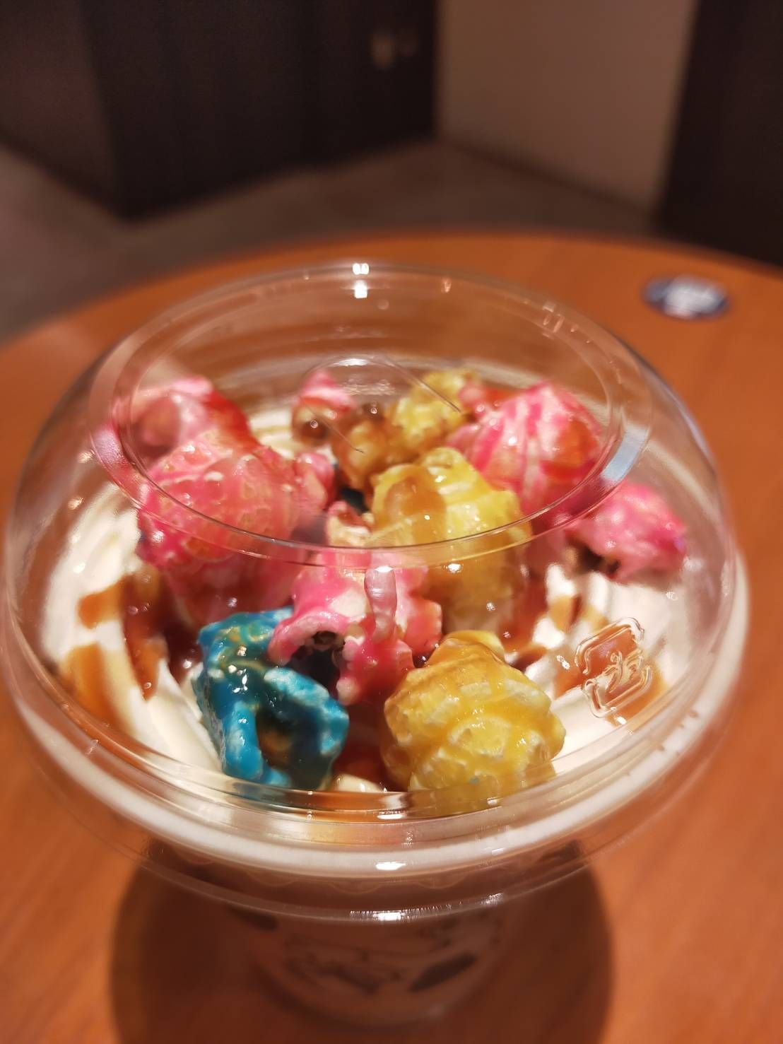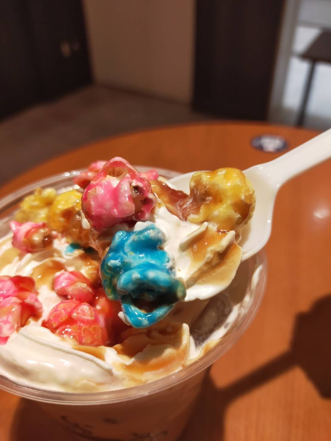 榛果拿鐵上的鮮奶油堆疊了三種顏色的爆米花,再淋上褐色的焦糖醬,讓整杯飲品更顯繽紛。而取餐時會拿到吸管和湯匙,讓人可以如同品嘗甜點般,用湯匙舀起爆米花細細品嘗。雖然色彩斑斕,但在味覺上和一般甜味爆米花無二異。