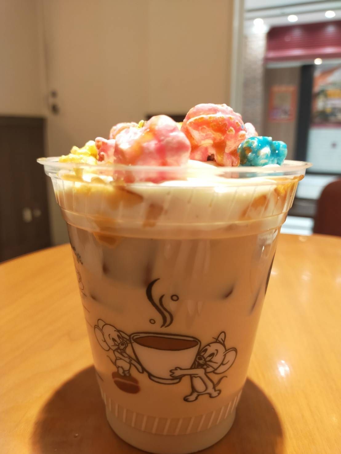 這次點了一杯「湯姆貓與傑利鼠 焦糖爆米花榛果拿鐵」,杯身上可以看到穿著圍裙的湯姆貓,以及用兩手端著體型比自己還大的傑利鼠。