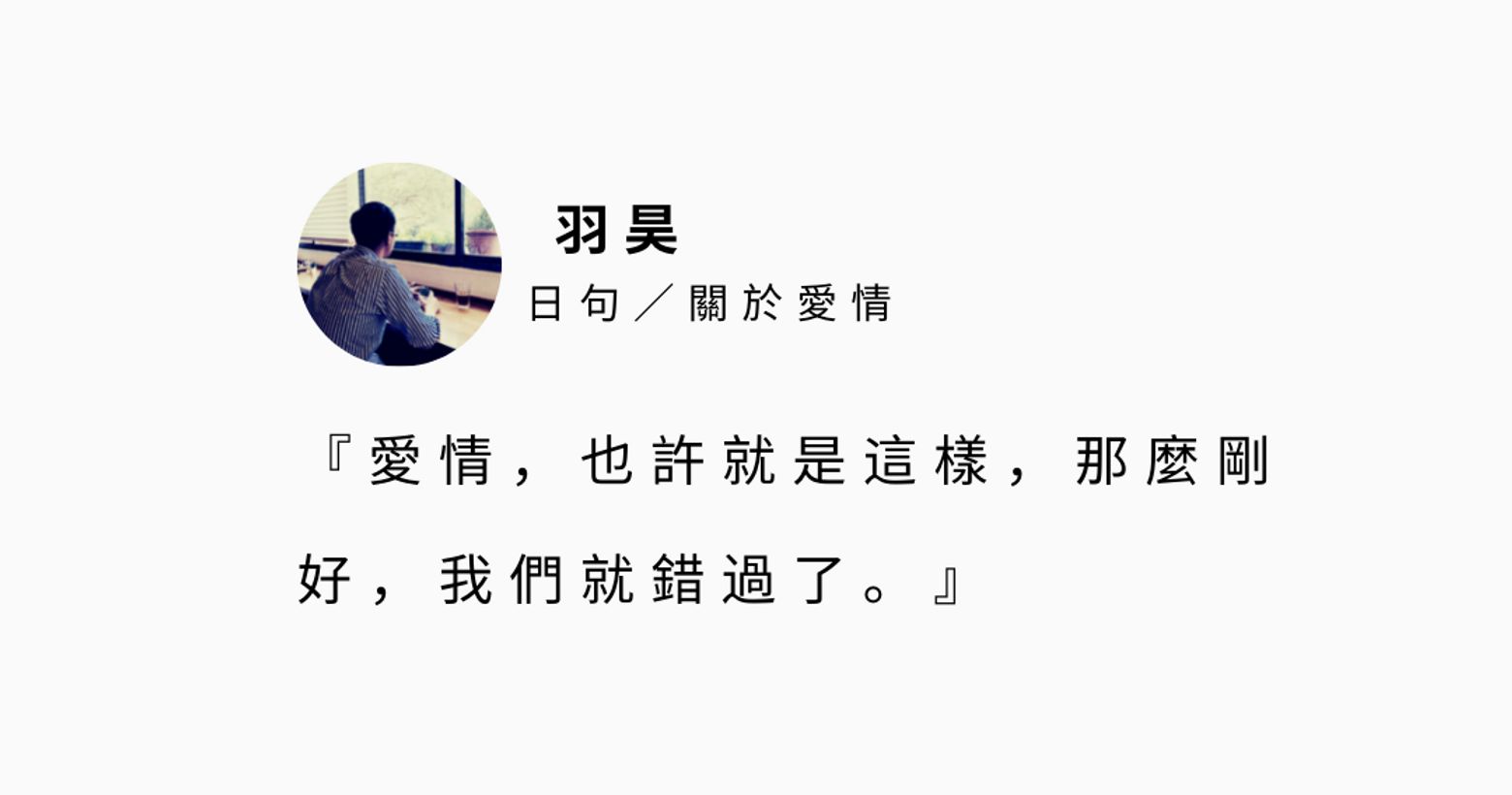 「 愛情,也許就是這樣,那麼剛好,我們就錯過了。」" That is LOVE which we just missed. " 愛情有時候就是這樣,就在一個轉角,剛好妳我差肩而過,就那麼簡單地錯過了彼此 ▌羽昊小公告 1.目前羽昊個人的的主題會以「關於你或妳」為主 ▍精選本月日日好文章 ➢請點我 ▍ 如果你覺得想了解關於羽昊請追縱 ⮯ ⮯ ⮯ 【Instagram Mastodon Facebook @日日文青 】 ▍如果波波們覺得內容不錯,請把羽昊追起來唷