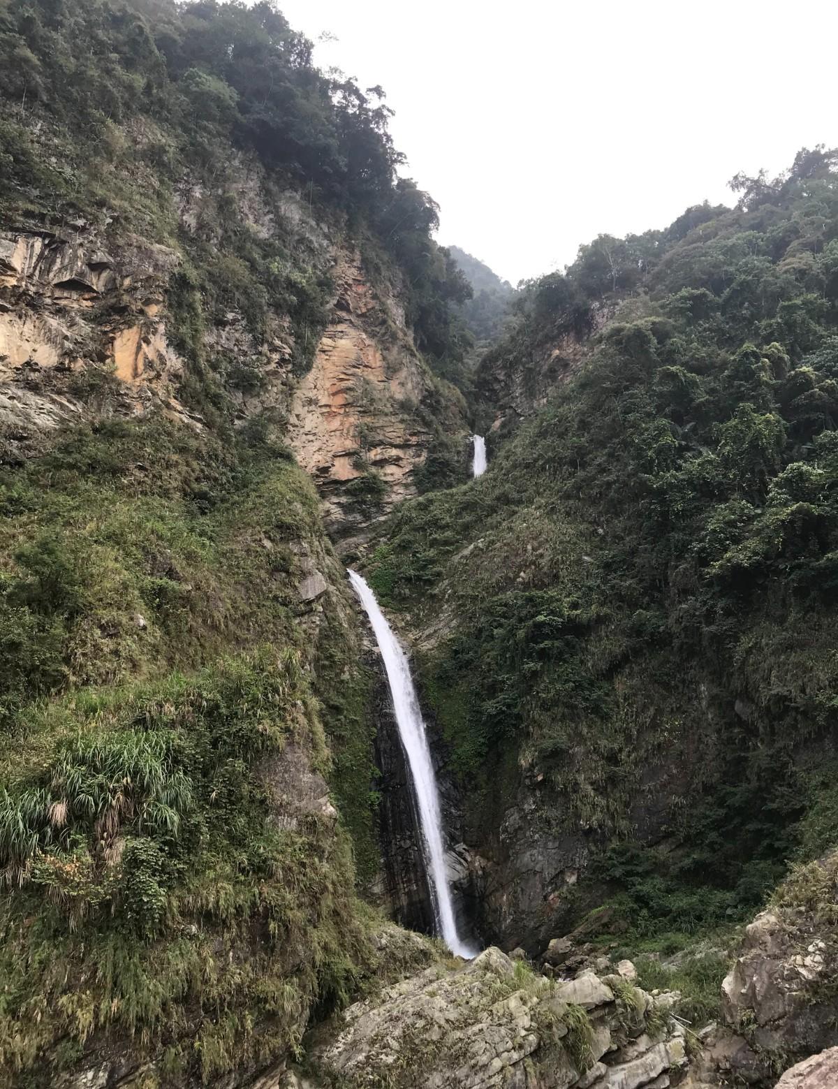走到橋底會看到"雙龍瀑布"因瀑布分為上瀑與下瀑,似兩條蛟龍盤旋而得其名,分為上、下兩段,溪水高處傾瀉而下極為壯觀。