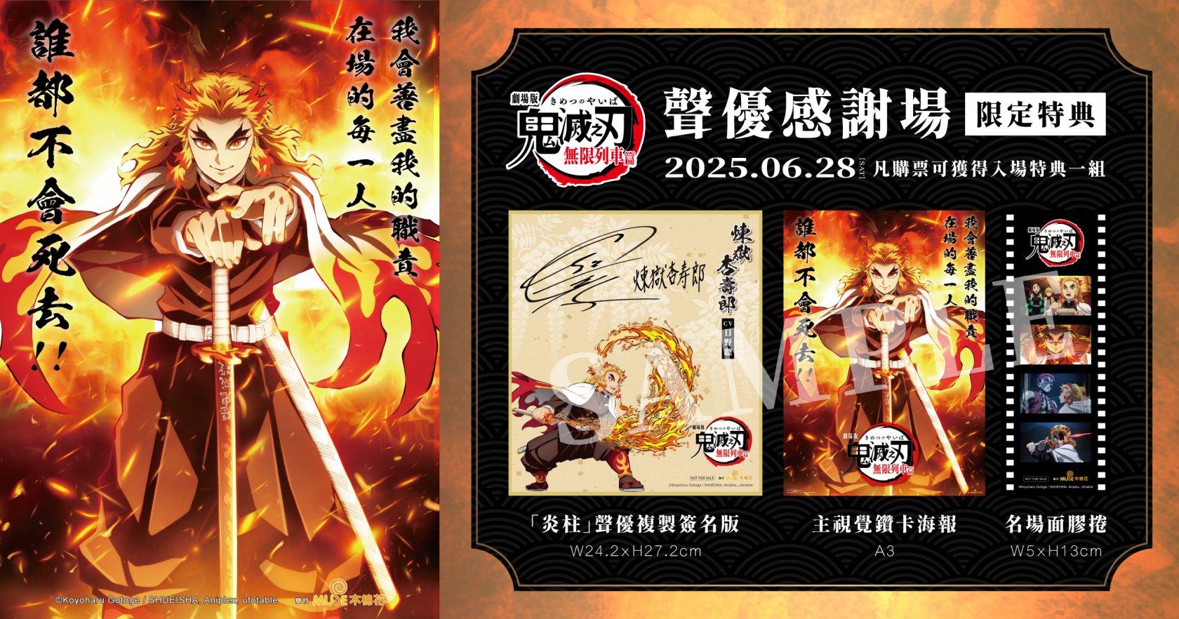 參與《劇場版「鬼滅之刃」無限列車篇》聲優感謝場,可獲得活動限定的特典一組,其中包含「炎柱聲優複製簽名版」、「主視覺鑽卡海報」及「名場面膠捲」各一份,《鬼滅之刃》的粉絲千萬不能錯過!