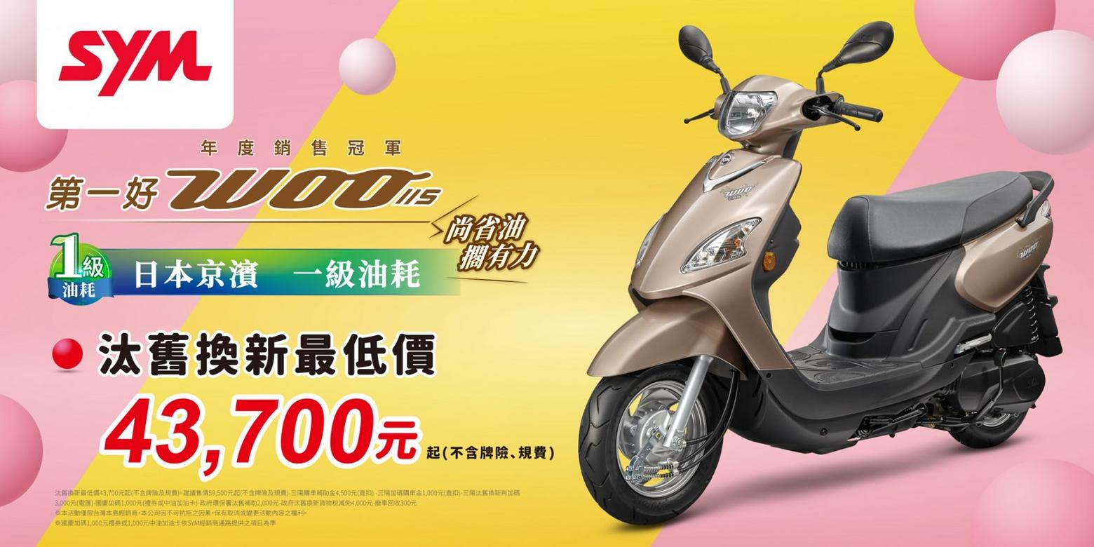 SYM女性通勤族及家庭用戶熱銷車款『第一好WOO115』,以3大DNA『好品質、好安全、好省油』及靈活輕巧車身廣受消費者喜愛,更是年度銷售冠軍長青樹,為慶祝雙十國慶三陽再加碼1,000元(禮券或中油加油卡),祭出汰舊最低價43,700元起(不含牌險、規費),讓你輕鬆好入手。