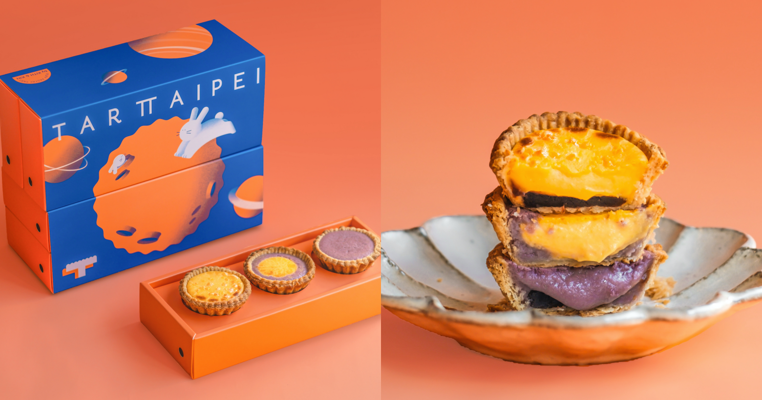 TART TAIPEI首年推出的中秋禮盒包裝設計充滿童趣與奇幻想像。以象徵中秋的玉兔及圓弧裙邊酥塔為設計理念,延續品牌亮眼艷橘色系,銀河藍增添未來感,讓消費者跟著月兔進入酥塔造型月球探索美味異想世界!堆疊兩個外盒還可拼成一輪酥塔明月,精巧童趣又不失時尚質感。內裝鹹蛋黃豆沙、芋泥鹹蛋黃、芋泥豆沙三種口味各二入,每盒售價588元,適合闔家團圓分享、或做秋節贈禮,傳遞誠摯心意與溫暖祝福!
