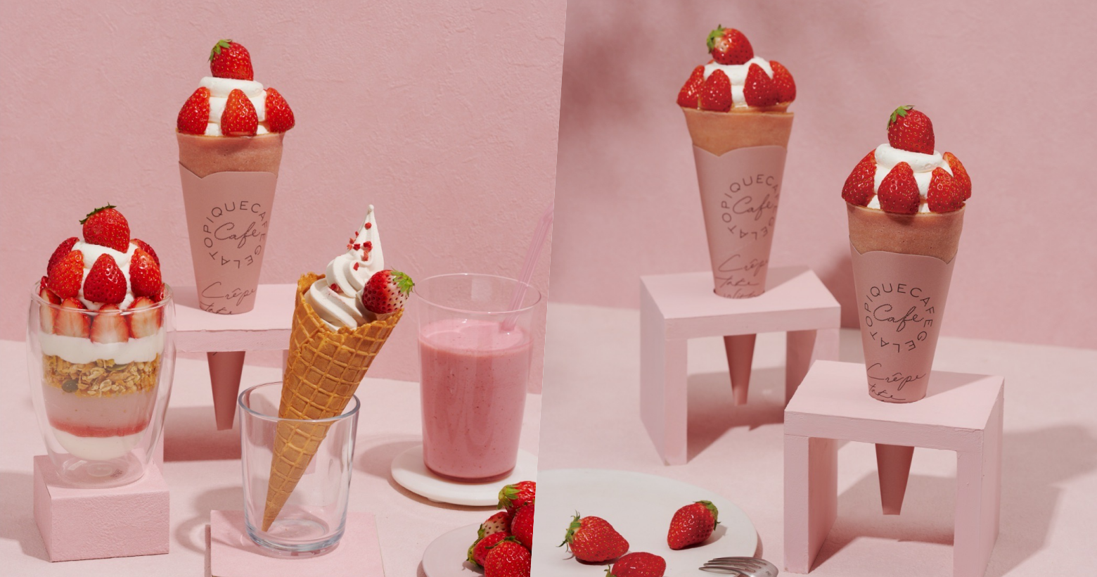 在日本和台灣都有高人氣的gelato pique café萬眾矚目的粉色草莓季開跑,今年大量使用新鮮大湖豐香草莓,三款濃郁系甜品交織大湖草莓的馥郁與嚴選奶香蜜甜,經典復刻版「草莓樂園可麗餅」連可麗餅皮都沾染草莓的粉嫩!不僅夢幻草莓樂園開張,還有酸甜醇厚的「草莓蜂蜜奶昔」、「草莓牛奶霜淇淋」,三款每日皆限量供應,一年就等這一季的草莓控,每天必衝滿足味蕾!