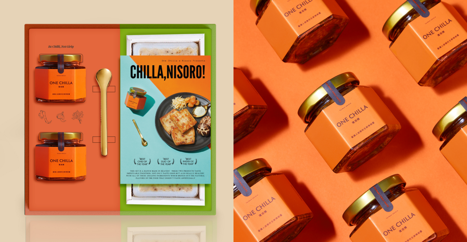 灣沏辣與NISORO的合作初衷,使於雙方都堅持要健康美,就要吃到對的食物,同樣都是使用高品質原料,製作過程單純不添加人工調味,講求低油、低糖、低納、低卡,同時對視覺與味覺的美都有一定的堅持,聯名禮盒應運而生。「沏辣 你瘦了 chilla, nisoro!」禮盒特別以灣沏辣的標準色愛馬仕橘,配上NISORO的青檸綠,搶眼的視覺色系更顯時尚姿態,打破傳統框架的經典組合,送禮自用都體面。