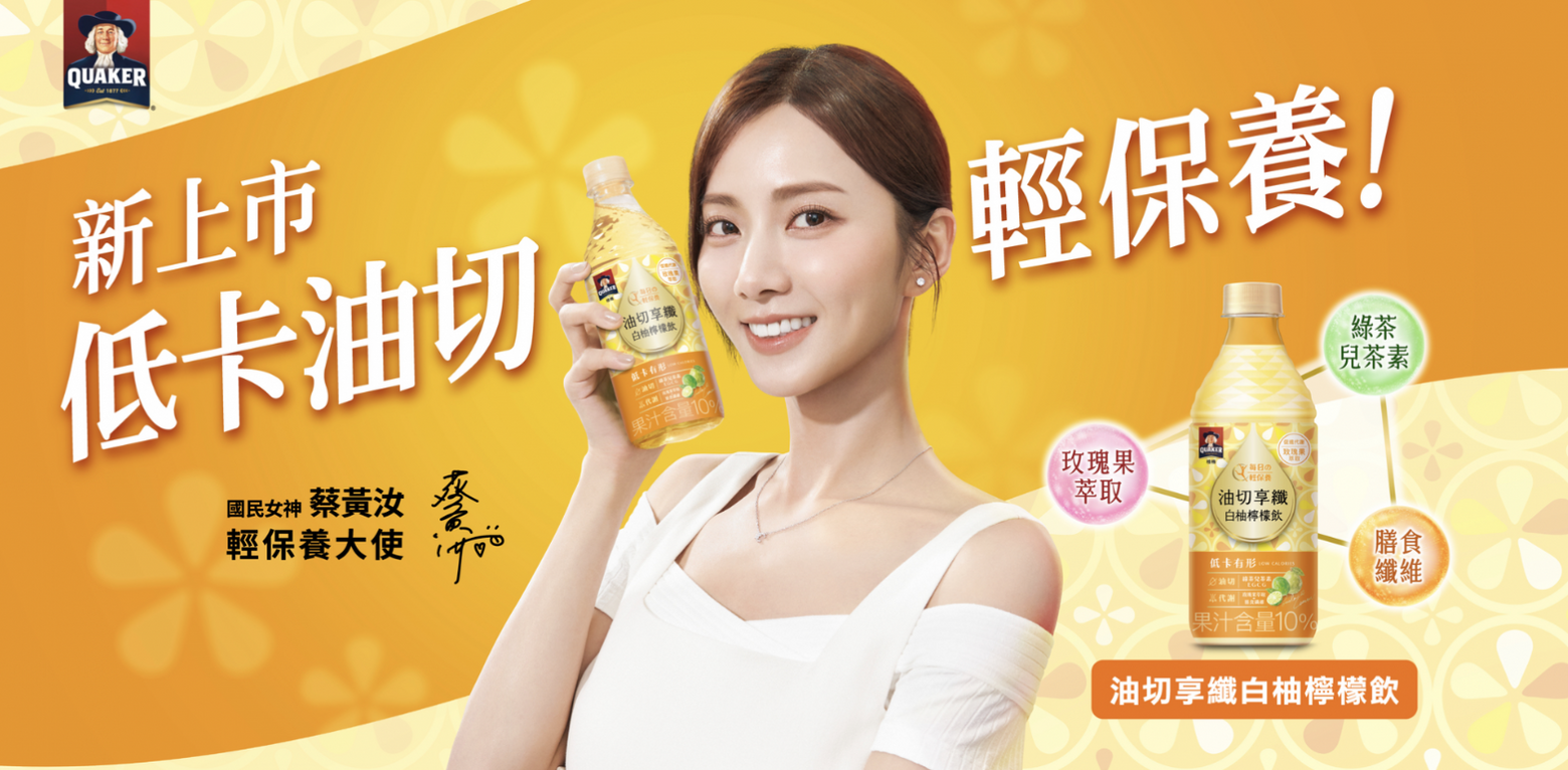 為了滿足消費者的需求,《桂格》機能飲系列 2025 年全新推出「油切享纖白柚檸檬飲」,以專利素材與技術開發出油切素材,能促進代謝、低卡低熱量,風味上完美結合酸香清爽的白柚與檸檬,提供全新夏日飲品選擇,暢飲之餘,也能維持纖盈身形!《桂格》2025 年再度邀請國民女神蔡黃汝(豆花)擔任品牌輕保養大使!在主持、戲劇、歌唱跨領域認真經營的她,無時無刻都需要讓身形、容貌和精神維持最佳狀態。這時能提供多元訴求的桂格機能飲就是她每日輕保養的最佳後盾,桂格自 2024 年分別推出訴求提神的「桂格補氣養蔘蜂蜜飲」與訴求美顏的「桂格美顏膠原莓果飲」,2025 年再度推出訴求低卡油切的機能飲料「桂格油切享纖白柚檸檬飲」,提供滿足解渴又能兼具健康的飲料選擇。兼具人氣與親和力的蔡黃汝絕對也是桂格機能飲全新系列產品「油切享纖白柚檸檬飲」的最佳代言人。