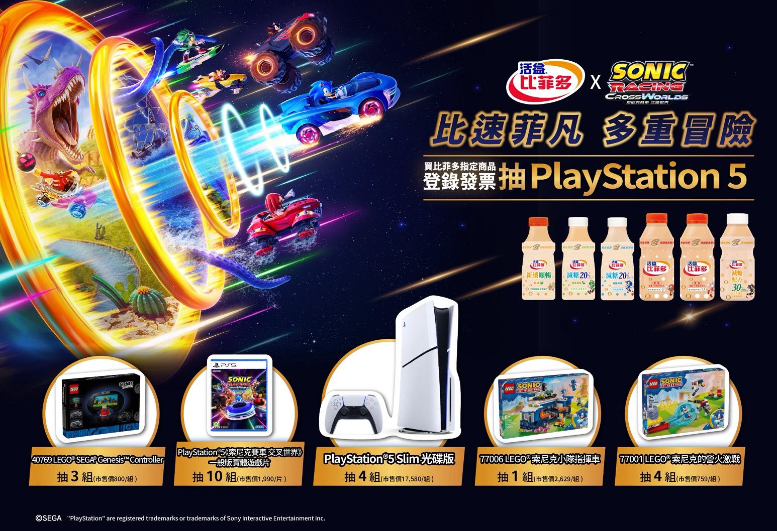 於期間購買比菲多350ml(全口味)、471ml(全口味)、1177ml(全口味)及1795ml(全口味)登錄發票即可抽PlayStation®5 Slim 光碟版及PlayStation®5《索尼克賽車 交叉世界》一般版實體遊戲片等超值好禮,與遊戲好友一起拚手氣(發票登錄詳情請見比菲多官網)!