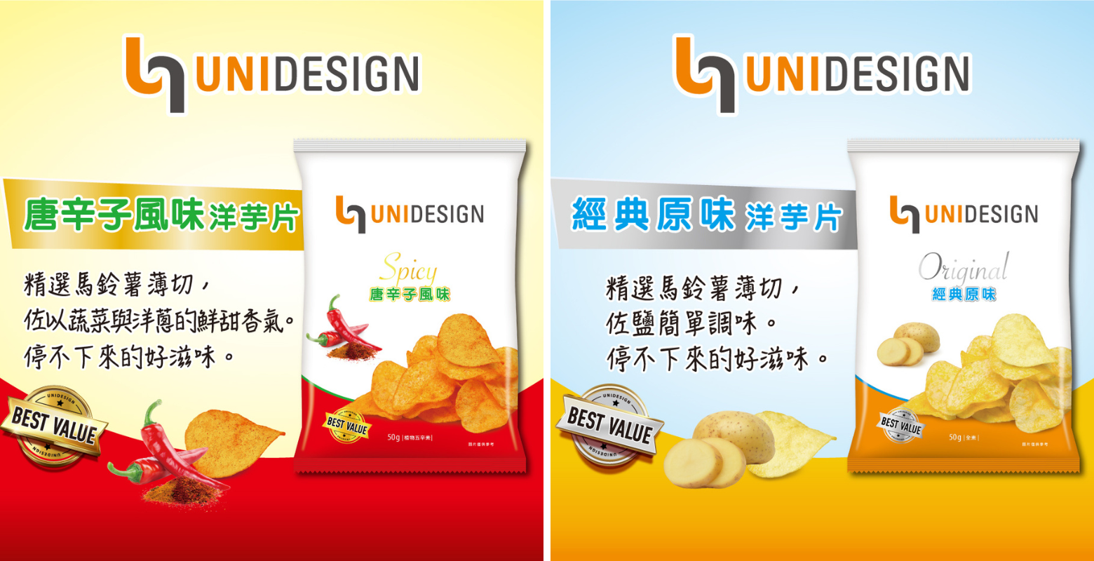 生活質感品牌UNIDESIGN帶來全新驚喜!首次推出零食新品——UNIDESIGN洋芋片,包含「經典原味」與「唐辛子風味」兩種口味,讓消費者能以輕鬆價格享受一流品質與美味兼具的原切洋芋片。
