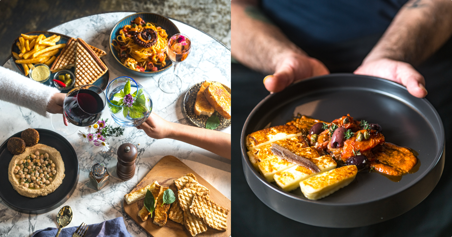 嚴選台中Dida Creamery職人乳酪高品質手做哈魯米起司,不易融化的特性最適合煎烤,鹹香滋味,口感有如雞肉般彈嫩,更因此獲得「歐美借素食雞肉」的稱號,搭配炙燒蕃茄、卡拉馬塔橄欖、酸豆、鯷魚和自製哈里薩醬(火烤甜椒、蕃茄紅醬和地中海風味香料製成)。
